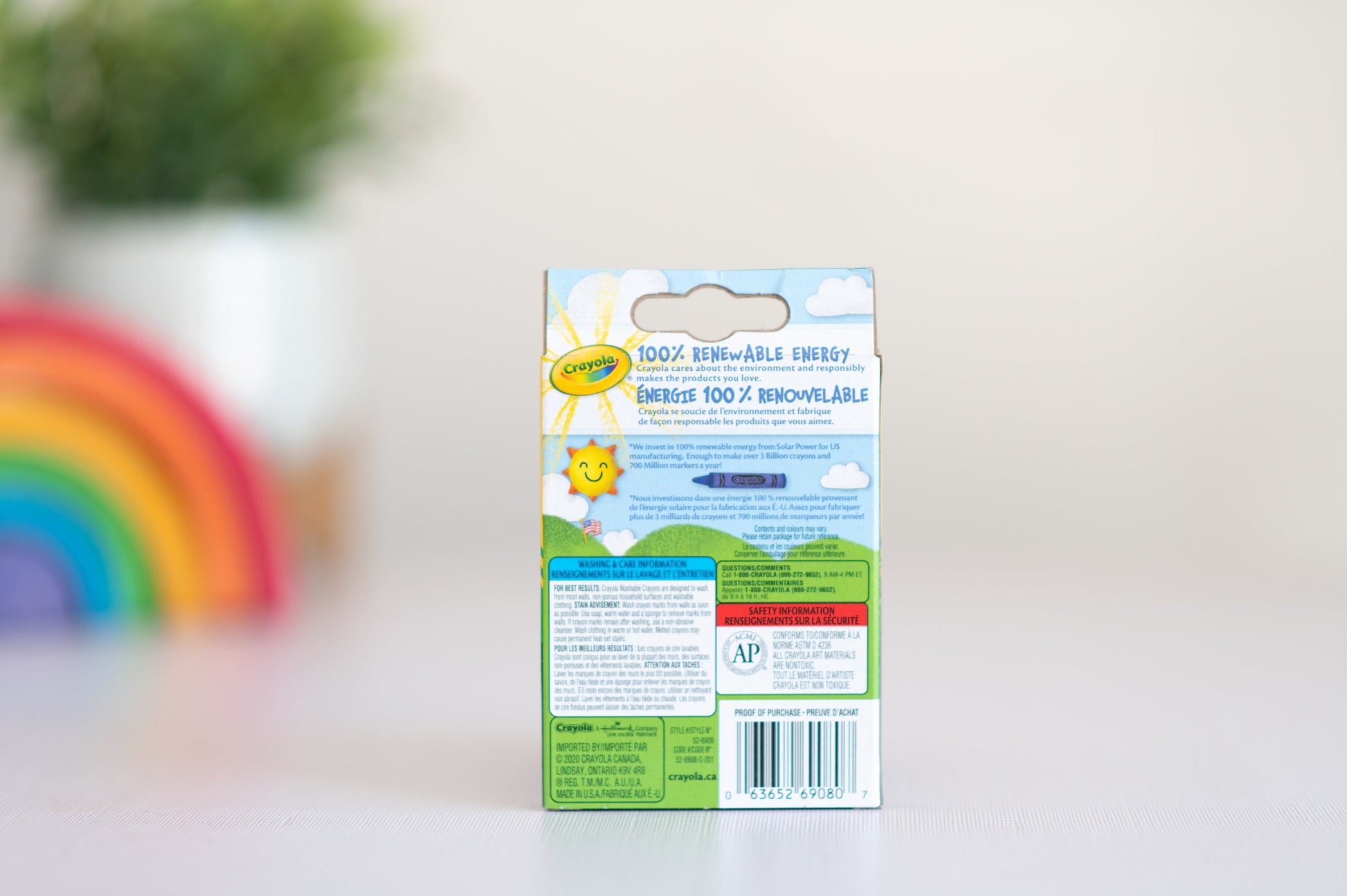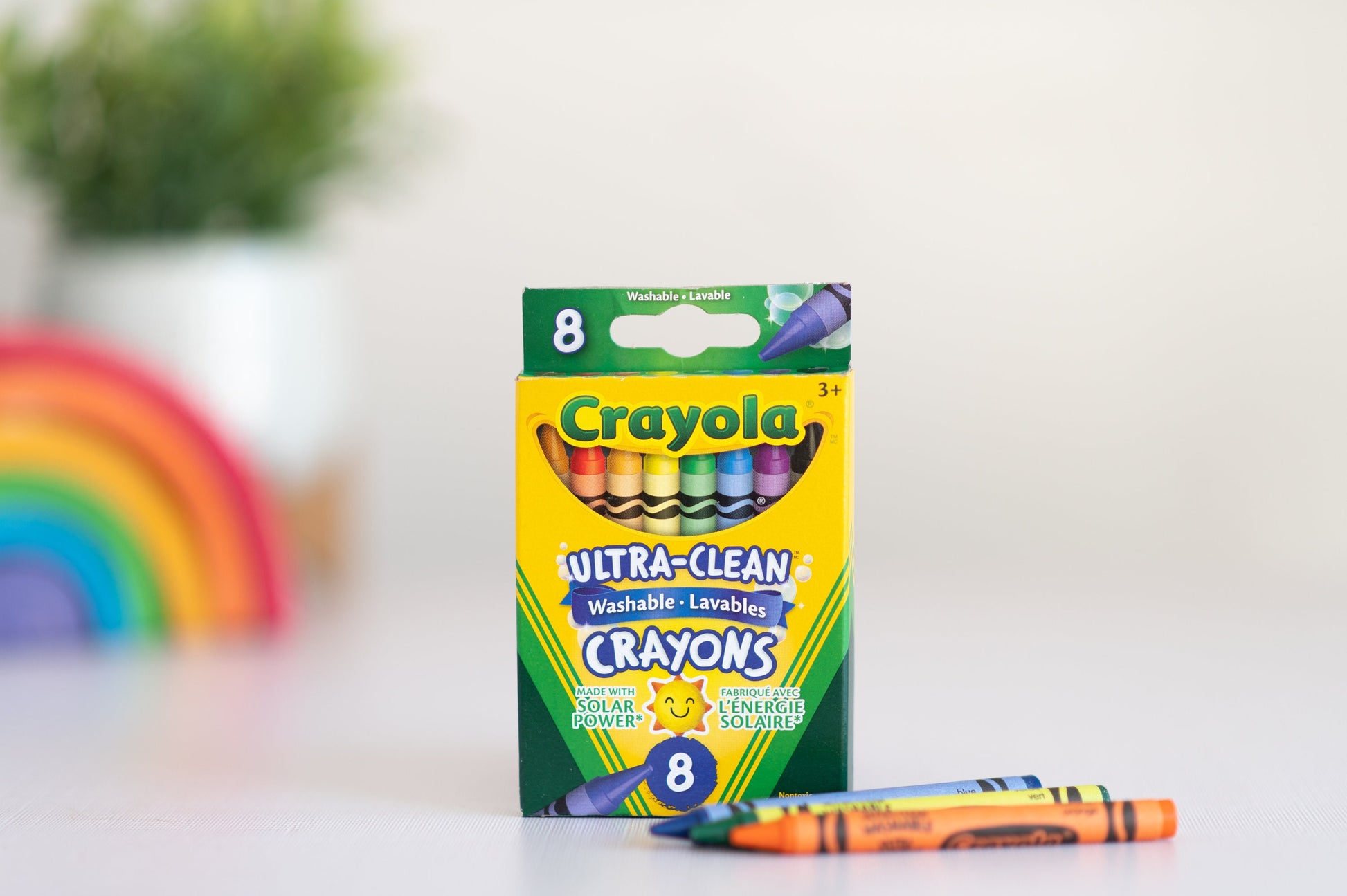 WASHABLE CRAYONS: Washable from skin, painted walls, and most washable clothing.