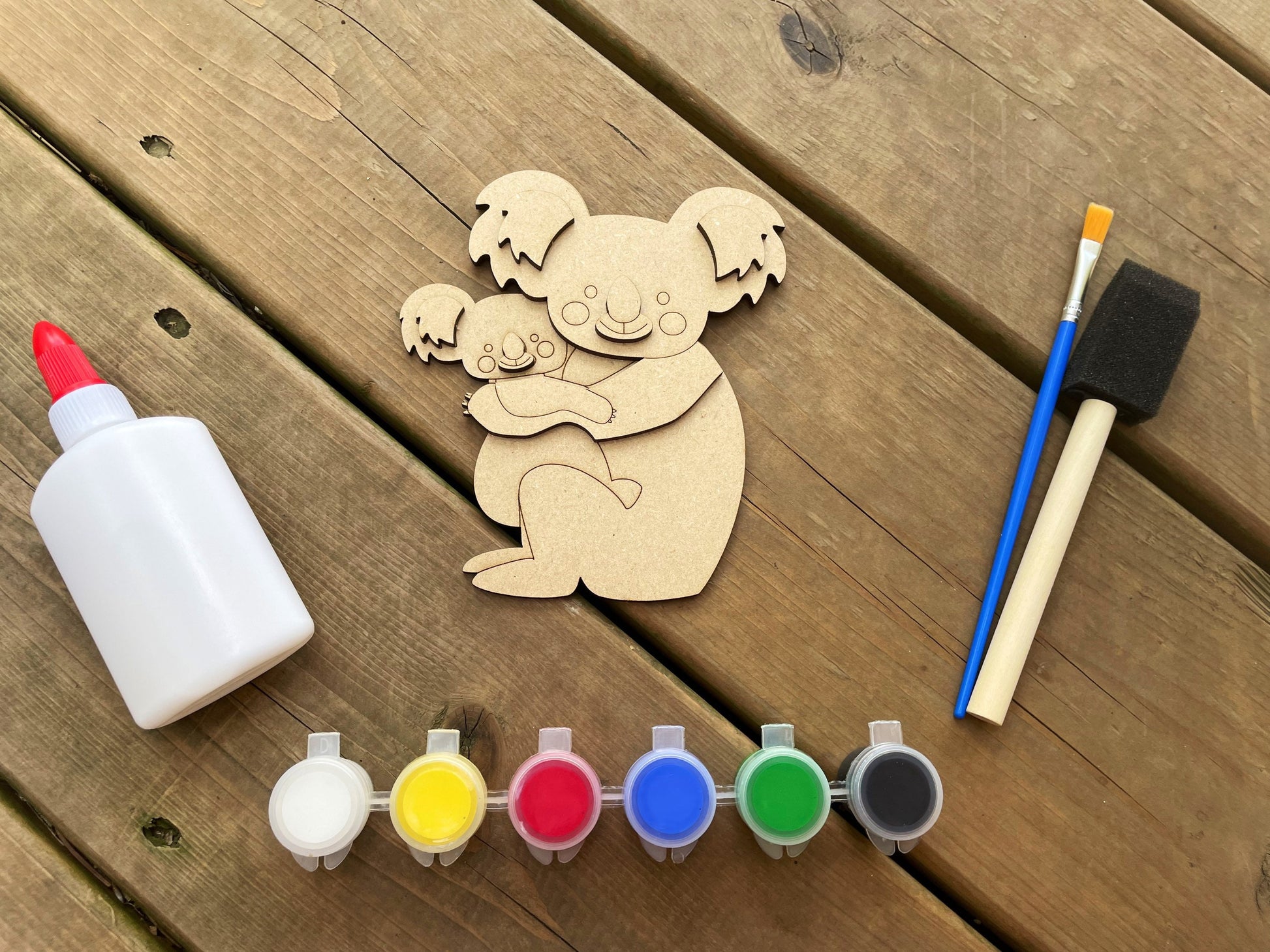 ✨ Fun and crafty wooden laser cut shapes with everything you need in a box! This is a sweet little mother and baby koala set!