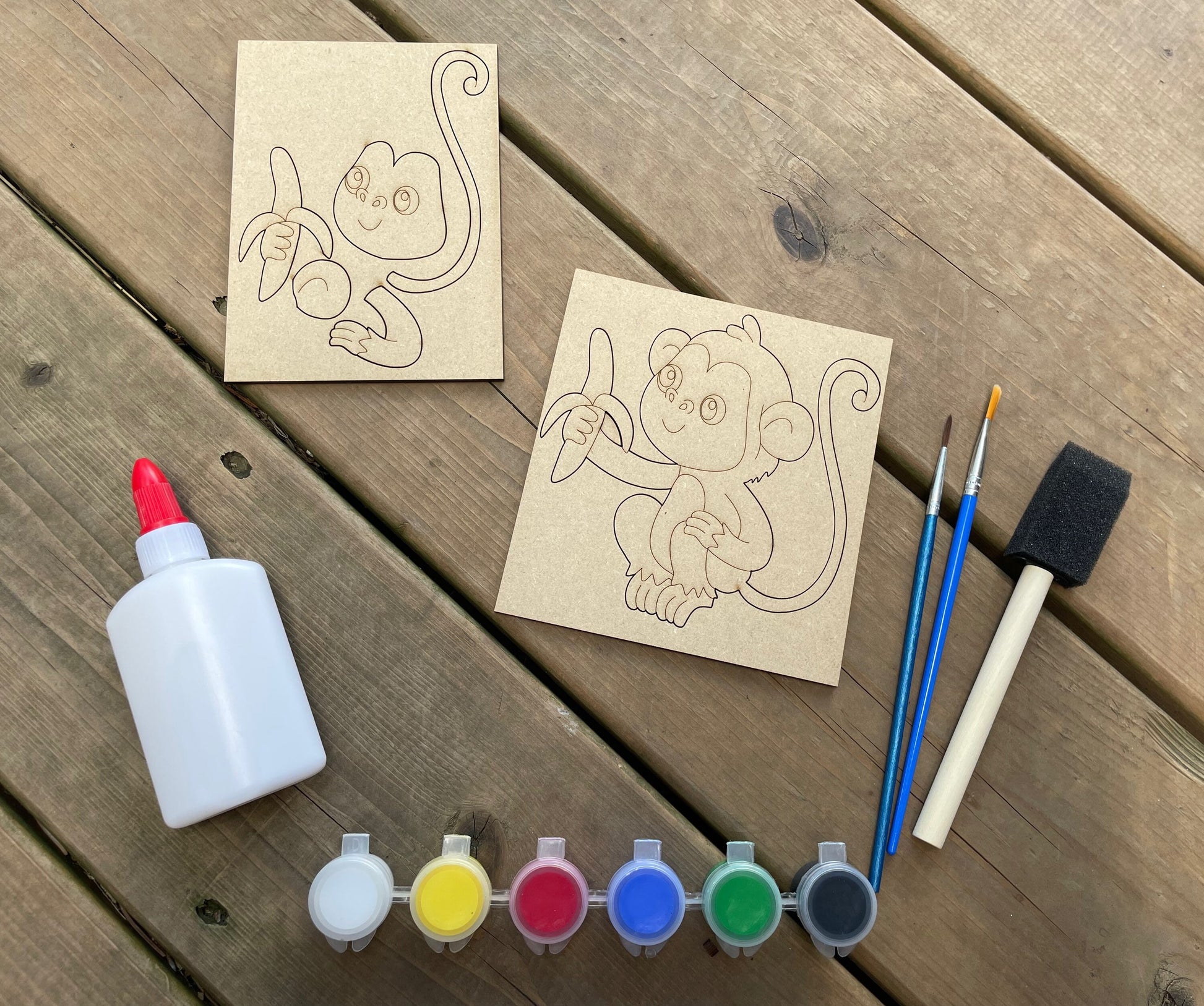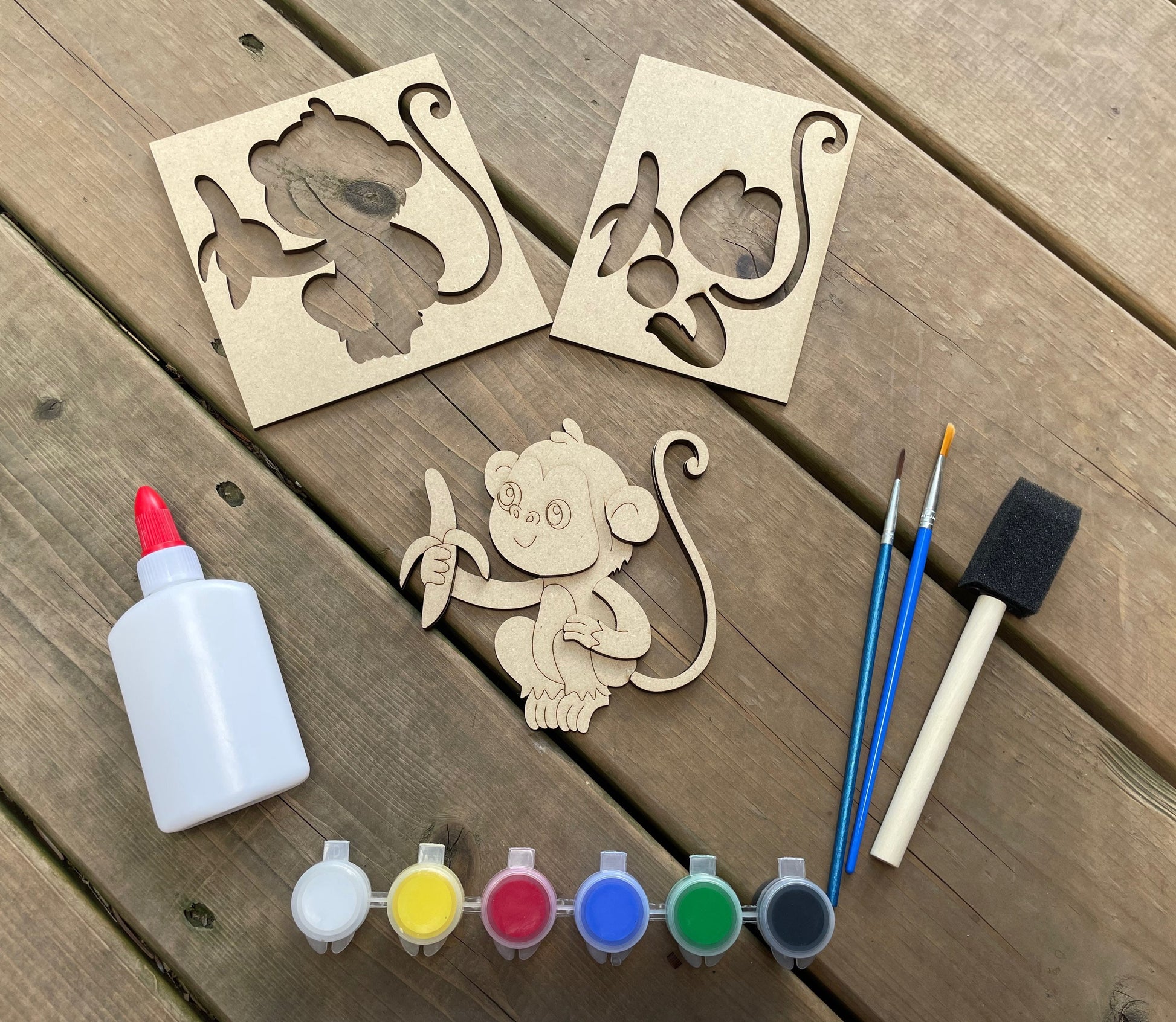 ✨ Fun and crafty wooden laser cut shapes with everything you need in a box! This is a sweet little monkey set!