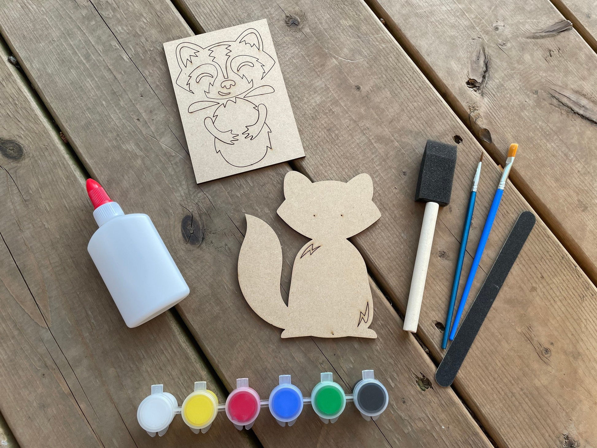 ✨ Fun and crafty wooden laser cut shapes with everything you need in a box! This is a sweet little raccoon set!