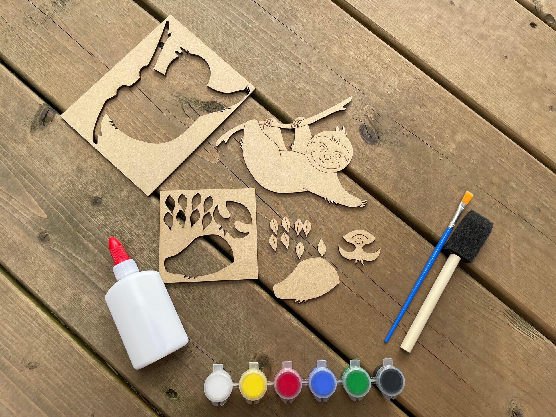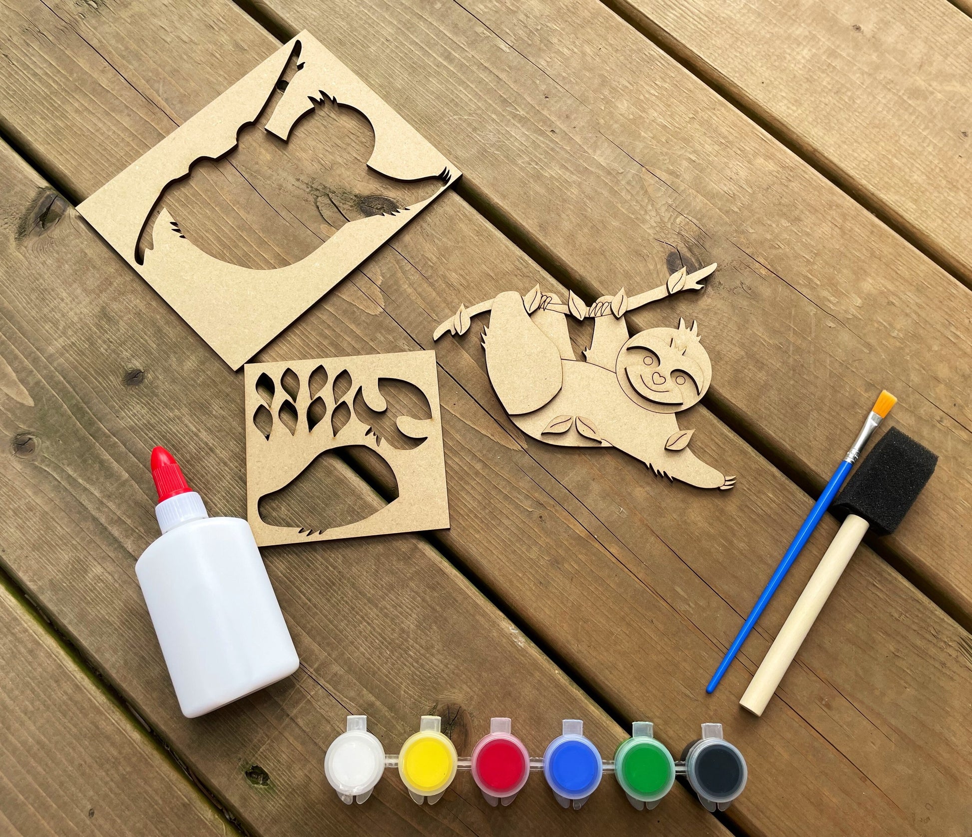 ✨ Fun and crafty wooden laser cut shapes with everything you need in a box! This is a sweet little sloth set!