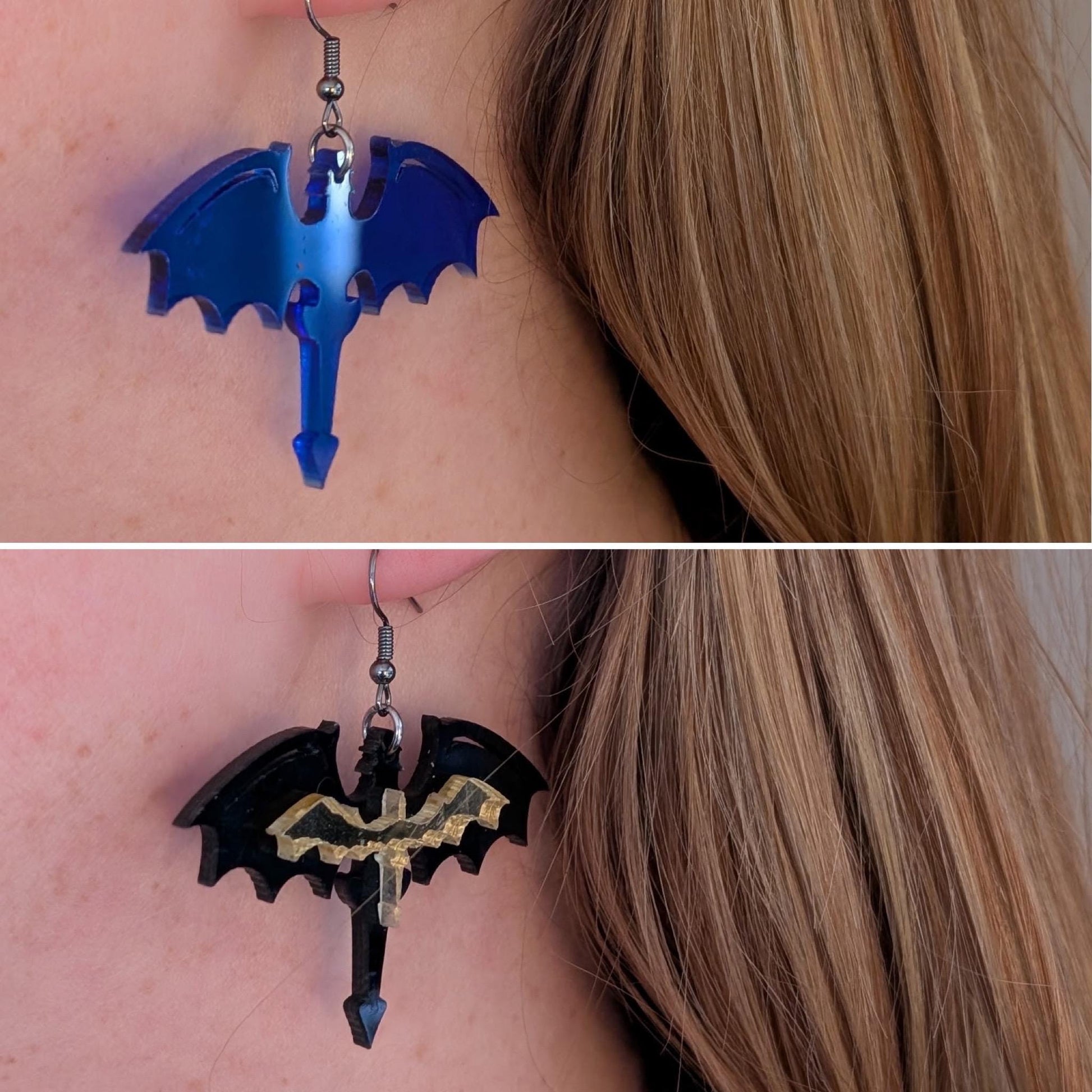 • The other earring showcases Sgaeyl in vibrant blue, fierce and regal.