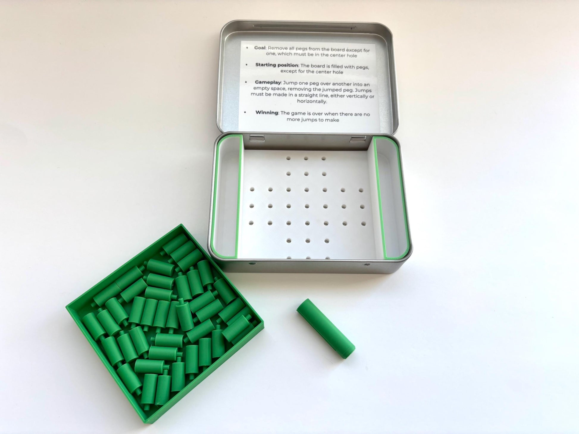 Challenge yourself with the timeless game of Peg Solitaire, now in a compact, travel-friendly design! Perfect for quick brain-teasing sessions at home, on lunch breaks, or while traveling. This portable set fits neatly inside a durable tin, making it easy to take anywhere without losing pieces.